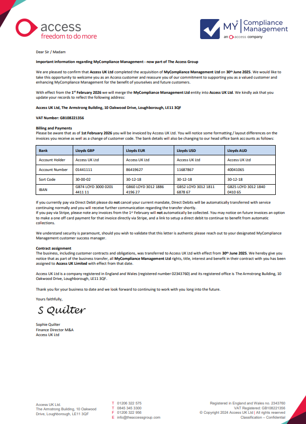 Important information regarding MyCompliance Management - now part of The Access Group